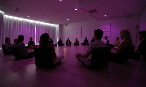 Participants meditate during a class at Unplug, a new meditation studio in Los Angeles. Photograph: Katie Falkenberg/LA Times via Getty Images----