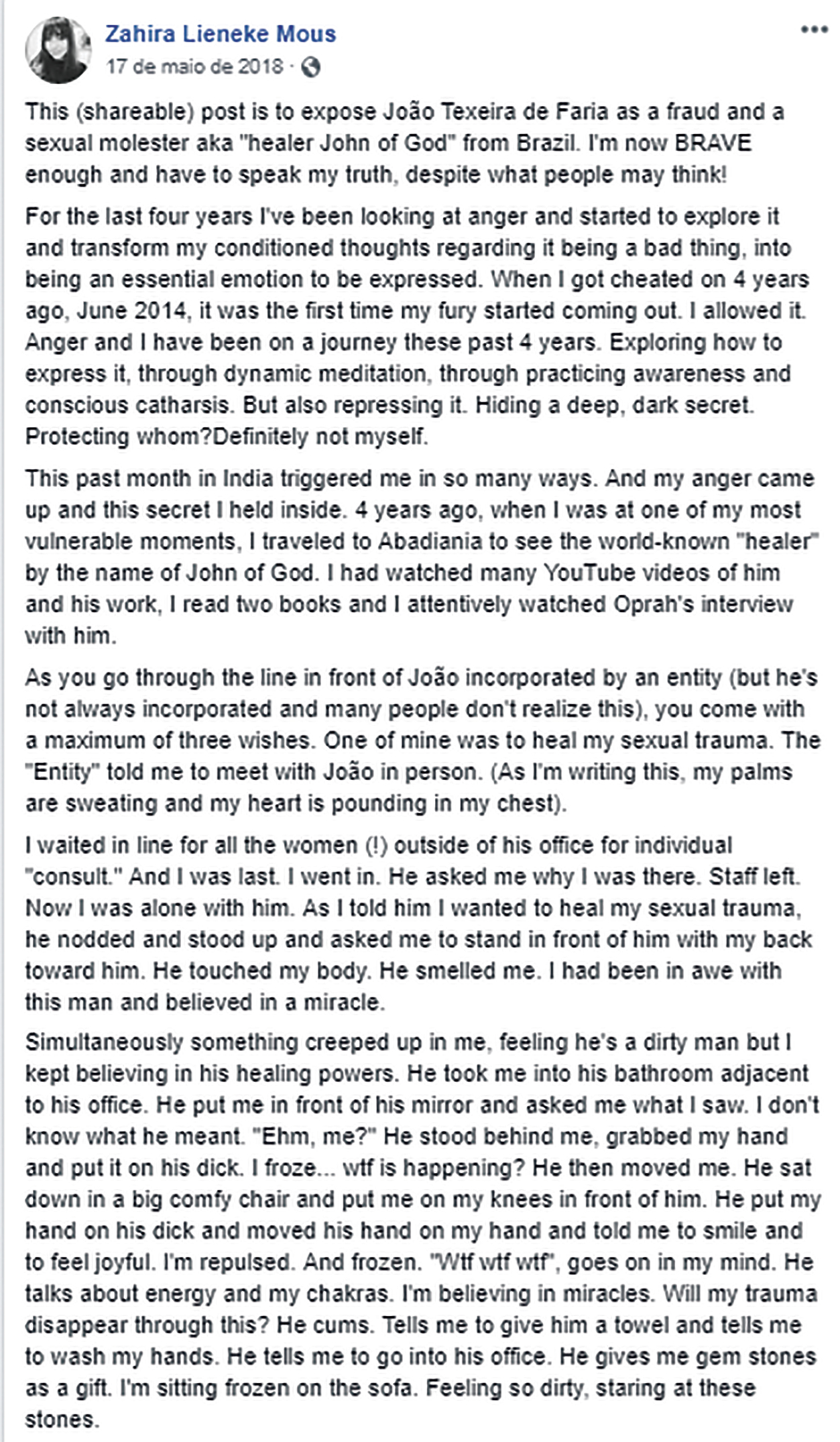 One woman, who did not want to be identified, went to Abadiânia in 2013 after going through a divorce. In the open session, the claimed entity in John of God told her to meet the medium in his private room after the session. In it, John told her he would be behind her to perform an “energy alignment.” Then John told her to put her hands on his penis, as that was the cleansing and she needed his energy that comes only that way. Another victim, a Dutch choreographer named Zahira Mous, came forward with a similar abuse report and confessed she did not go to the police because she was afraid that evil spirits would be sent and her life would become miserable. Furthermore, even though she suffered, Mous thought for a while that he was healing many people. Mous came forward in April 2018 when she posted on Facebook what happened to her at one of John of God’s sessions.
