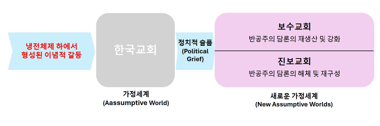 이를 한국교회의 상황에 적용해 보면 다음과 같다. 한반도 분단과 이념적 갈등은 한국교회로 하여금 ‘정치적 슬픔’을 경험하게 했으며, 이는 새로운 가정세계 형성의 계기로 작용하였다. 이 과정은 두 가지 방향으로 전개되었다. 하나는 분단과 반공주의를 넘어서는 방향이며, 다른 하나는 이를 더욱 부정적으로 강화하는 방향이다. 특히 분단이 초래한 정치적·이념적 상실은 나와 다른 이들을 타자화하며, ‘적’으로 만드는 조건으로 작용해 왔다. 이러한 구조에서 반공주의는 단순한 이념을 넘어, 가정세계를 유지하고 정당화하는 핵심적인 담론적 장치로 자리 잡게 되었다.