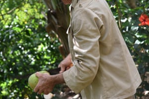FacebookTwitterPinterest Organic farmer Agustin Pimentel uses a machete to slice open a coconut on his organic farm in a remote valley in western Cuba. Photograph: Roger Atwood