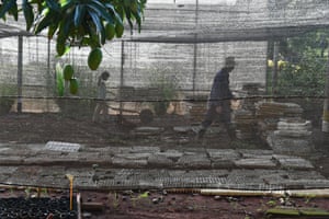 Workers tend to crop seedlings under a protective nylon film at the Alamar organic farm, in an outlying Havana neighbourhood, Cuba. Photograph: Roger Atwood