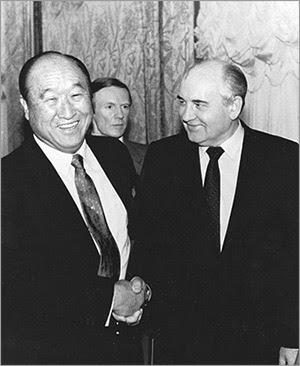 ▲ 1990년 모스크바에서 미하일 고르바초프 당시 소련 공산당 서기장을 만난 문선명 총재.