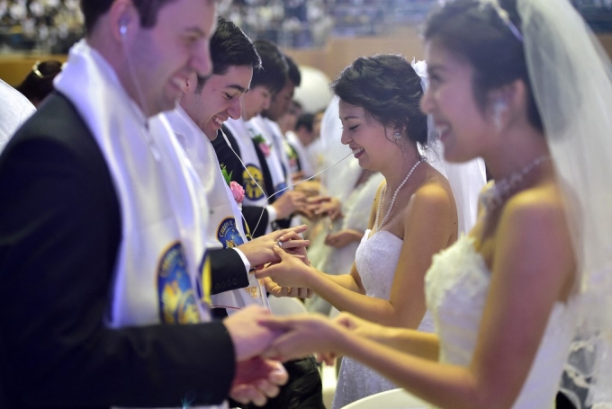 세계평화통일가정연합(옛 통일교)의 가장 중요한 의식 중 하나가 합동결혼식이다. 통일교는 1960년대 초부터 국적·나이 등과 관계 없이 남녀 교인들을 부부로 합동결혼식을 진행하고 있으며 이 의식을 거쳐야 원죄 없는 삶으로 거듭난다고 보고 있다. ⓒAFP=뉴스1