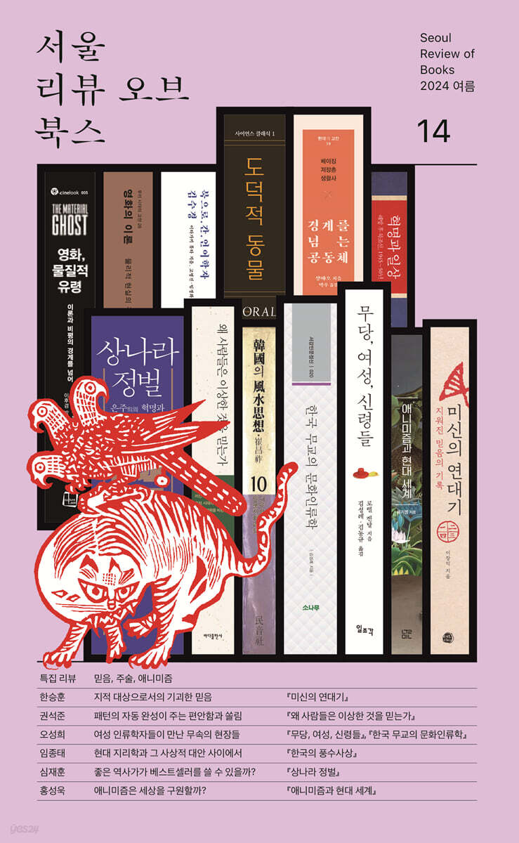 《서울리뷰오브북스》 2024년 여름호(14호)의 특집 주제는 ‘믿음, 주술, 애니미즘’이다. 우리는 무엇을, 왜, 어떻게 믿는가? 기성세대뿐 아니라 젊은 세대에게도 사주팔자와 신점이 인기이고, 디지털 시대에 걸맞게 전화와 스마트폰 메신저를 통해서도 ‘용한 곳’에 접속할 수 있다. 그러나 한편으로는 정치인이나 경영인이 ‘주술’에 의지한다는 혐의를 받으면 지지율과 주가가 요동친다. 무당·지관·장의사가 주인공으로 등장하는 영화 〈파묘〉(2024)가 오컬트 장르 최초로 천만 관객을 동원하는 동시에, OTT에서는 ‘사이비 종교’를 다룬 다큐멘터리가 공개되어 세간의 주목을 받고, 많은 이들의 분노와 경악을 자아냈다. 혹자는 근대로의 이행을 ‘탈주술화’ 과정이라 했지만, 2024년 한국 사회를 살아가는 우리는 여전히 주술과 함께 살아간다. 《서울리뷰오브북스》 14호에서는 이런 현실을 마주 보며 우리의 불가해한 믿음과 그 믿음의 대상들을 깊이 들여다보기 위해 종교학, 문화인류학, 과학학, 역사학, 자연과학 분야 전문가 6인이 머리를 맞댔다.